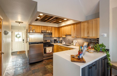 As you step inside, you'll be greeted by a warm and inviting open plan living area, complete with cozy seating and a rustic fireplace to gather around on cool mountain evenings. The fully equipped & stocked kitchen features modern appliances and everything you need to cook up a delicious meal easily.