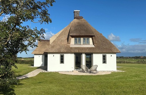 Unique thatched-roof house directly on the North Sea, with views as far as the lighthouse | House in Westerhever, Germany