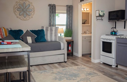 This adorable studio apartment features a daybed with Trundle, stove, microwave, and refrigerator, with an amazing view of the Bay.