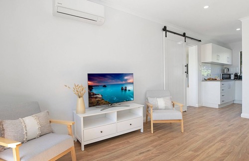Enter straight into the separate dining room, usually bathed in the Pacific sun. The solid wood table seats six, providing food for thought with glistening water glimpses and a delightful view of the evergreen hills. A charming barn door opens to the light-filled living area, the gentle beach décor adding to the air. And while the dining room energises with sunlight, the living room flows with the invigorating sea breeze, catching it in a way that few properties can. Lounge around here for a while, contemplating everything or nothing – it’s your holiday!