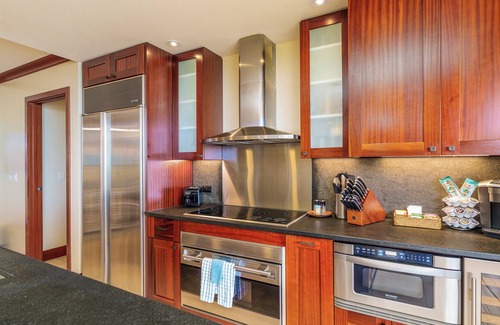 Fully equipped gourmet kitchen curated by renowned chef Roy Yamaguchi with state-of-the-art appliances and elegant honed granite countertops, ensuring a delightful culinary experience.