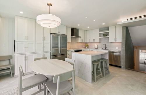Feel like a professional chef in the kitchen when you use the new Monogram premium-grade appliances to whip up a meal. Enjoy the customized storage solutions, leaving the counters clear. Dine at the table or the kitchen island, both serving ocean views.