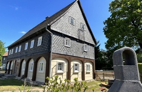 Historical 2-family house, 2 storeys, built in 1790, renovated in 2022. 500 m from the centre of Großschönau, 12 km from the centre of Zittau, 30 km from the centre of Löbau, 20 m from the river. For shared use: natural state property (fenced). Private: hot tub. Bread roll service. Shop 500 m, supermarket 200 m, restaurant 400 m, bakery 300 m, bus stop "Großschönau Weinhaus" 700 m, railway station "Großschönau Bahnhof" 1.5 km, outdoor swimming pool 1.5 km, bathing lake "Olbersdorfer See" 13 km. Walking paths from the house 5 m, ski lift 4 km, ski school 4 km, cross country ski track 4 km. Well-known ski regions can easily be reached: Waltersdorf 4 km. Well-known lakes can easily be reached: Olbersdorfer See 13 km. Please note: Additional accommodations can be booked.