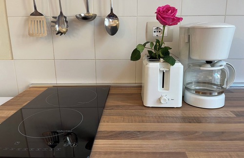 The modern KITCHENETTE includes a 2-burner induction stovetop, microwave, refrigerator with freezer, American coffee maker and coffee, toaster, electric water kettle, cookware, dishes, glasses, and utensils. Towel and dish soap.