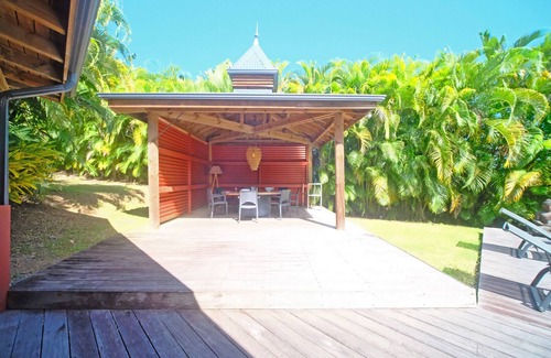 Nestled in the heart of a lush tropical garden filled with banana trees, coconut palms, bougainvilleas, and traveler’s palms, Villa Venusia invites you to an idyllic getaway in an enchanting setting where peace and serenity reign supreme. Charming Rental in Petit-Bourg Villa Venusia, with its serene ambiance and zen-inspired decor, is the ideal address for a dream vacation in Guadeloupe. Wooden walls adorned with colorful paintings, high ceilings, and a subtle blend of local and global influences create a unique atmosphere. The wooden floors and thoughtfully designed layout enhance the exotic and distinctive character of this exceptional place. Charming Villa in Guadeloupe From the moment you arrive, you'll be immersed in the villa’s soothing atmosphere. The wooden shutters allow soft light to filter through, giving you a sense of outdoor living while staying comfortably indoors. The surrounding nature blends harmoniously with the villa’s architecture, creating a most pleasant stay. The living room and kitchen connect to form an open and welcoming living space. The villa features two air-conditioned bedrooms, each with its own en-suite shower room. These rooms, opening onto the tropical vegetation and the pool, offer a peaceful setting and unmatched serenity. Vacation in Guadeloupe: Villa with Pool and Garden for Rent in Basse-Terre Under the gazebo by the pool, enjoy friendly meals with family or friends, all while being gently caressed by the tropical breeze. The lush garden offers a true haven of peace, with a shaded resting area under the coconut trees. The terrace and pool, nestled in the greenery, provide perfect moments of relaxation and pure bliss. Petit-Bourg is the ideal destination for nature lovers and those seeking authenticity. Just a stone’s throw away, you’ll discover must-see sites like the majestic Carbet Falls, the Mamelles Park, as well as numerous waterfalls and rivers. Be sure to visit the local distilleries for an immersive experience of Guadeloupean culture—with tastings, of course. Villa Venusia, a true hidden gem, will enchant you with its discreet charm and unique ambiance, making you want to extend your stay.