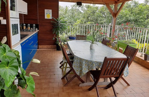 Located 15 minutes from the airport and 2 minutes from the village of Saint-Esprit, this comfortable apartment (more than 160m2) can accommodate up to 7 people. It has 3 large bedrooms (2 with A/C, and 1 with a ceiling fan). Each bedroom has an en-suite shower room. The apartment contains a fully equipped kitchen, a TV lounge, a dining room, and a terrace with a sitting area and a large dining table. The large glass windows in the kitchen and in the dining room offer beautiful garden views.