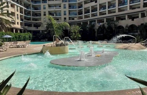 Nestled in a friendly residence with three swimming pools, including one with a waterslide for children's enjoyment, this living space promises an unforgettable stay.
