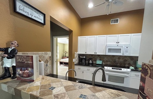 Our turnkey villa has everything you need to enjoy your home-away-from-home. Master Bedroom has a King-bed with on suite bathroom with a separate huge shower and a jetted tub. Guest bedroom has a queen bed and bathroom with a shower/tub combination next to the bedroom. We have a den / office with access to the pool which can be used as a third bedroom with a sleeper couch perfect if you're working remotely or just want a quiet place to read or do Zoom/FaceTime with clients or family. The large lanai overlooking the pool is surrounded by a huge yard with a lot of vegetation for additional privacy with a tropical feel. 2-car garage offers extra space bikes, kayaks, small boat etc that you may bring with you.