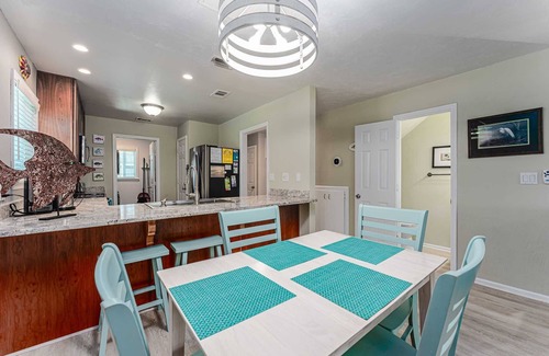 The main level screened in porch is equipped with a picnic table, ideal for casual dining. The upstairs suite opens to a private deck, the perfect spot for soaking in Gulf views. This newly renovated home also features granite countertops, rich cherry cabinetry, and a fully stocked kitchen with upgraded cookware, abundant silverware, and all the serving and roasting essentials you need.