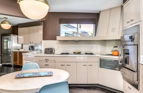 Back inside, the large kitchen is an incredible homage to midcentury design, complete with St. Charles ‘desert beige’ metal cabinets, but has been updated to offer you all the conveniences you need. You’ll find newer appliances, a 6-burner range with griddle, tons of counter-space, warming drawers, wine fridge, and multiple sinks.