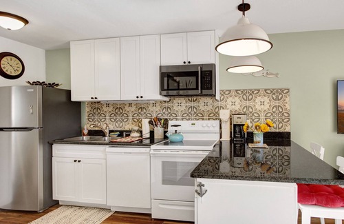 To your right is the modern full-sized kitchen with all the necessary amenities (electric stove, an oven, a microwave, a refrigerator, dishwasher, coffee maker, toaster, cookware, etc) with a breakfast bar and two highchairs.