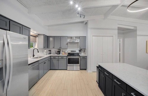 With bright playful pops of color, this vibrant bungalow offers a plethora of entertainment activities! The spacious backyard features a 24-ft circular pool, a jacuzzi, firepit, patio, and grill. Inside, you’ll find an open-concept layout for easy socializing as well as a fully equipped kitchen, 4 bedrooms and 2 bathrooms. Don’t wait - you won’t want to miss out on this hidden gem!