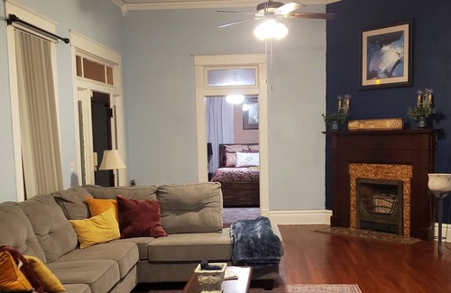 This Victorian home is great for a quick getaway or an extended stay. Guests have access to the entire 3000 square foot home all on one level. Comes complete with all the kitchen appliances (range/oven, microwave, refrigerator, dishwasher, coffee pot). Home has 3 bedrooms (all with queen beds) and can sleep up to 6. Sheets, towels, and pillows are provided. Two full bathrooms - one with clawfoot tub only and one with shower only. Living Room has a TV. Washer and dryer available in the home. Free WiFi.