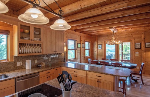 The heart of the home is the huge great room, featuring an exquisite floor-to-ceiling river rock gas fireplace, flanked by a wall of windows that bring the view inside. There's plenty of comfy seating here around the fire, and a large flatscreen TV. The great room flows into the dining room, which seats 8. The dining room, in turn, is adjacent to the large chef's kitchen, appointed with hickory cabinetry, granite counters, and a spacious island with a downdraft cooktop. This kitchen is equipped with a dishwasher, microwave, coffee maker and everything else you need for entertainment and meals at home. There's also a half bath on this level, for guests.