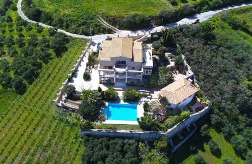 Various terraces and relaxation areas embrace the property and its oversize swimming pool. Amidst the rocks and garden above the pool are comfortable sun loungers and relaxing sitting places in the shadow of old mulberry and lemon trees, while the mountain, the hills and the sea view dominates the scene. Two separate outdoor dining areas are perfect for entertaining guests during hot sunny days or for romantic dinners. The property stands alone for your privacy and is surrounded by olive groves and vineyards .