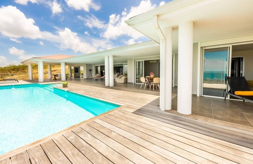 Amara 1 Villa is a beautiful large and modern villa of 400 m2 with an incredible panoramic view on the Caribbean sea. With a large garden and a big wood terrasse of 200 m2 you can enjoy the sea view from the large pool. The villa fits 4 large bedrooms including 2 king size beds, and is the perfect place for incredible vacation with family or friends. Good internet and a desk in a quiet bedroom make it perfect for teleworking. Located on the very touristic Caribbean cost of the island, you will be only 5 minutes car distance form beaches, restaurants and shops. You will enjoy fantastic and beautiful sunsets every evening from the terrasse and the pool.