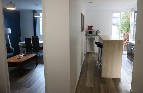 1930's town house of 130m², fully renovated with garden and private pool. On the ground floor, living room with a large screen TV, a kitchen and a pantry, a bedroom with bathroom. On the floor 3 rooms with their own bathroom. WIFI and Internet provided. The garden has a terrace with table and chair, as well as sun baths. The property is fenced, closed by a gate.
