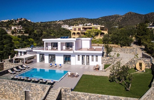 The villa is built on a 1.500sqm plot on a hillside and offers beautiful views of the Mirabello Bay. Outside the main living area is a huge terrace with a 68sqm pool, modern comfy sun loungers, a shaded dining area and a BBQ spot and a sauna.