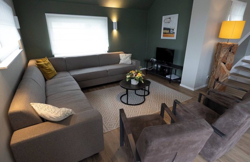 The ground floor consists of a stylish lounge with a seating area and a dining area. The seating area has a television. The fully equipped open kitchen has a gas hob, combi-oven and dishwasher. From this room you can also access the balcony with outdoor furniture where you can enjoy the natural surroundings. The ground floor also has a separate toilet and storage area.