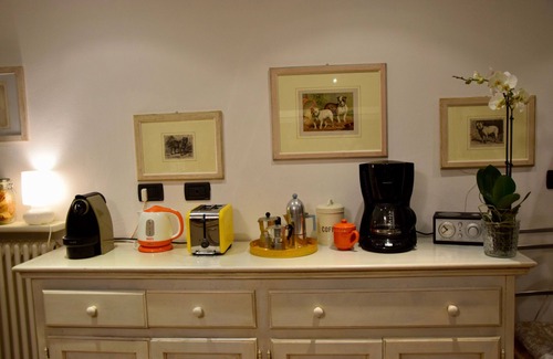 On the lower floor there is the reading room and then the fully gourmet equipped kitchen with barbecue. In the kitchen you will find LAVAZZA COFFEE MAKER, american coffee maker, blender and mixer, microwave, electric kettle, toaster. From the kitchen we have direct access to the dining room in the veranda facing the garden and the outside small kitchen with 2 stoves and barbecue.
