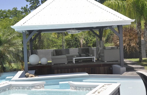 The outdoor space is very friendly and not overlooked (perfect for your privacy!) with a large carbet and a deck with a view of the superb infinity pool with its Californian beach. You can also enjoy a superb 7 seater jacuzzi. You will appreciate at the deck level, the superb outdoor lounge with its bar overlooking the swimming pool. Feet in the water you can be served and enjoy your cocktail!