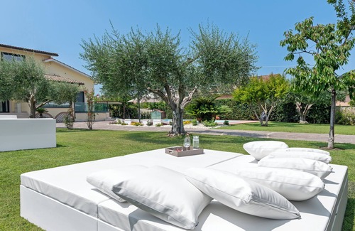 La Villa dei Sogni is the perfect oasis for those seeking tranquility without sacrificing the convenience of reaching the heart of the Eternal City, the sea of Ostia Lido, and Leonardo Da Vinci International Airport. The spacious 10x5.5 pool, surrounded by an enchanting 1,500 m² Mediterranean garden with precious trees, offers a unique atmosphere. The luxury furnishings, dining area, relaxation area, a maxi bed, and sun loungers complete the luxury stay experience.