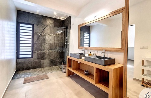 ✅ A second bathroom with a walk-in shower, a double basin and a hair dryer.