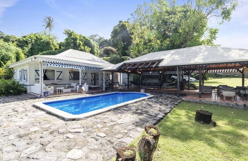 This vacation home is an exceptional villa with a pool located on the heights of Saint Pierre on the north Caribbean coast of Martinique. Featuring three air-conditioned bedrooms, including two double bedrooms and one children's room (4 beds) and two bathrooms, it can accommodate up to 8 travelers. A fully equipped kitchen and a bright living room with TV complete the interior layout. The large garden facing the sea offers beautiful fruit trees (guava, mango, cherry...), and a large relaxation area. A large L-shaped terrace around the pool offers various relaxation areas and a dining area facing the sea.