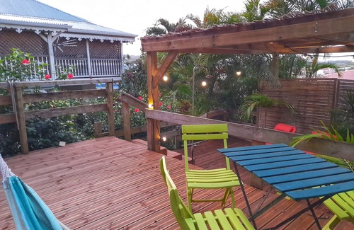 The studio Bwa Banbou, sea view, comfortable, new, independent access, is on the ground floor of the villa Flowers Islands. Its surface, with its deck terrace, is 30 m2. The studio is nestled in a tropical garden full of fruit, flowers and plants.