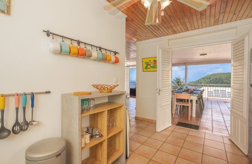 It is a villa overlooking the fishermen village of Anses-d'Arlet and the Caribbean sea; it is located 150 m from the beach and boasts 5 bedrooms, two of which are air-conditioned, 3 bathrooms with a walk-in shower, 2 separate toilets, 2 fitted kitchens, 2 living rooms with televisions, a DVD player, and a mini stereo system, and Wi-Fi. There is a large terrace with garden furniture, a hammock, a 180° sea view, and a garden level terrace with a pool. The villa also features 2 washing machines and 2 tumble dryers. Linen is provided (sheets, towels, tea towels), beach towels are also provided.