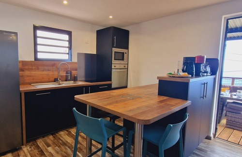The kitchen is open plan, overlooking the dining room with a table for 10 people. It is fully equipped with quality appliances such as (oven, microwave, dishwasher, induction hob, refrigerator with freezer compartment, Nespresso, kettle, filter coffee maker, toaster, blender...) the dishes are complete (flat plates, crucibles and desserts) glasses also (water, wine, and champagne) oven dishes. The kitchen is convenient to prepare food and be at the same time with the rest of its guests.