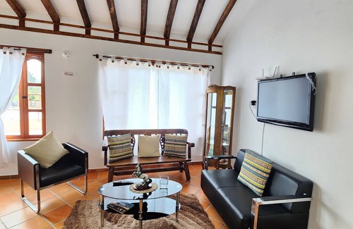 Nestled in Villa de Leyva, this 2-bedroom, 2-bathroom apartment brings it all within your reach. Fans of nature and the outdoors will love being 11 minutes by car from Pozos Azules and 25 minutes from La Periquera Ecological Park. You'll easily make the quick 3-minute drive to Antonio Nariño House Museum or the 4-minute drive to Plaza Major of Villa de Leyva.