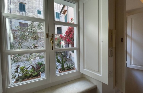 From the stone terrace, a few marble steps lead to the \"Studio,\" which is naturally pleasantly air-conditioned in summer due to the old walls, with a beautiful view of the old town and the green hills. Right in front of the \"Studio\" entrance, there is a cozy covered relaxation area.
