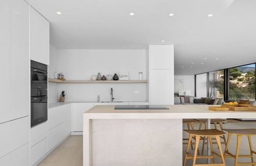 The villa’s modern design, infused with bohemian chic elements, creates a sophisticated yet welcoming atmosphere. Expansive floor-to-ceiling windows fill the interior with natural light, offering uninterrupted sea and mountain views. The open-plan living and dining areas provide ample space for relaxation, while the fully equipped kitchen is perfect for culinary enthusiasts. A dedicated office space allows guests to work in a stylish and peaceful setting.