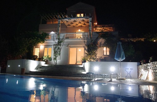 Luxurious villa; high-standing services, television, french channels; dish washer and washing machine. Cleaning will be made once a week; air-conditioned; infinity pool and panoramic sea views, 5min from the beach; sea view, large terrace with BBQ, overlooking the sea. 3 bedrooms with terrace and sea view. 5min away by foot from a village with tavern and grocery.