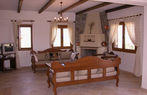 Villa Kalithea is arranged on two floors. The entire ground floor is open-plan (except for a useful downstairs shower room/WC) with a comfortable sitting area arranged around a feature fireplace, a dining area opening onto an L-shaped terrace and a fully equipped kitchen complete with full-size cooker, microwave oven, dishwasher and a large fridge-freezer, as well as toaster, kettle and coffee maker.