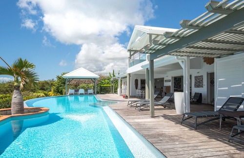 Villa Karukera welcomes you to a modern, spacious setting, ideal for large families or groups of friends. With 5 air-conditioned bedrooms, each with en-suite bathroom, you'll enjoy absolute comfort and the privacy you need for a relaxing vacation. The spacious living room opens onto the infinity pool, providing the ideal space for relaxation, while the pool table and darts add a playful touch to your stay. The fully-equipped kitchen and outdoor terrace with barbecue let you make the most of outdoor living, with breathtaking sea views. A very large garden is ideal for children to play in complete safety.