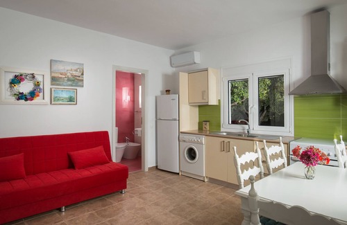 - Ground floor offers an open plan living room with modern kitchen, a twin bedroom and a three piece recently fitted bathroom. It also offers direct access to a garden full of olive, linden and lemon trees and flowers. Under the linden trees there is a sitting area (table with chairs) where you may enjoy your meals and drinks. The garden also offers plenty of room for sun beds.