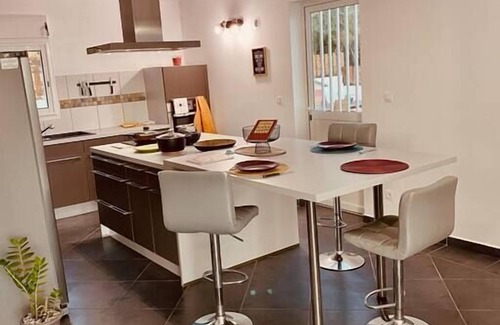 The villa has 4 bedrooms and 2 bathrooms, providing optimal comfort for your stay. Each room at La Villa Lyla is a haven of comfort, air-conditioned to offer you peaceful and restful nights. In the morning, you can wake up to a fresh atmosphere and prepare yourself for a day of discoveries. You can prepare delicious meals in the large, fully equipped kitchen, and enjoy the panoramic view from the large veranda, which has floor-to-ceiling windows. The large equipped kitchen of La Villa Lyla will allow you to prepare your favorite meals with ease.Show off your culinary creativity and treat yourself to local specialties or international dishes.