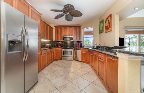 Take in the peaceful canal views and enjoy the calming surroundings from the comfort of your screened-in lanai. This outdoor space features a large dining table and comfortable sun loungers—ideal for long, lazy afternoons.