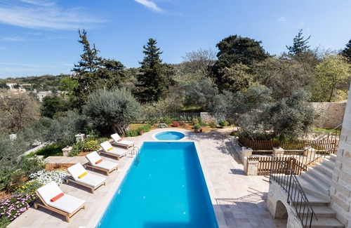 Villa Melpomeni is the latest super luxury addition to the complex of Vederi Estate. Is a complex multi award of four villas in a peaceful environment of an olive grove in the middle of green hills covered with cypresses and oaks. Ideal for relaxation and tranquility located next to the picturesque Prines village and just 10 minutes drive from the vibrant City of Rethymno and its wonderful sandy beaches. Villa Melpomeni is made of carefully selected local stone and wood in a unique design and decoration of traditional Cretan architecture that blends in harmony with the surrounding landscape, which can accommodate up to 10 people. Consists of 3 floors, has a fully equipped kitchen, a living room, gym, state of the art home cinema, dedicated meditation space, 5 bedrooms with ensuite bathrooms jacuzzi, plus a WC. Located in the middle of a forest overlooking an olive grove and the sea. In the outside area you can enjoy the beauty of nature, as the whole property is surrounded by flowers, plants and olive trees. It offers a big private pool with a children's pool, sun loungers, outdoor dining table and a private garden.