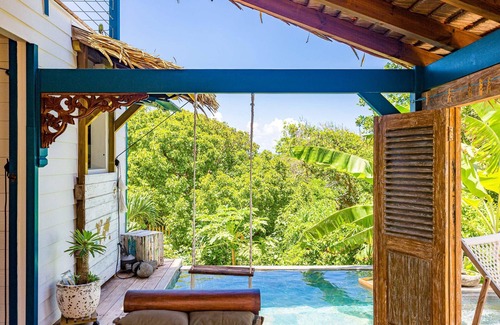 Villa Niaouli invites you to relax and unwind. Atypical construction, the owner has put all her soul of traveler, inspired by his discoveries while traveling the world. A swimming pool like a river flowing around a luxuriant vegetation. A hammock to bask in the sun. The comfort of the air-conditioned room with a direct view of the sea beyond the treetops.