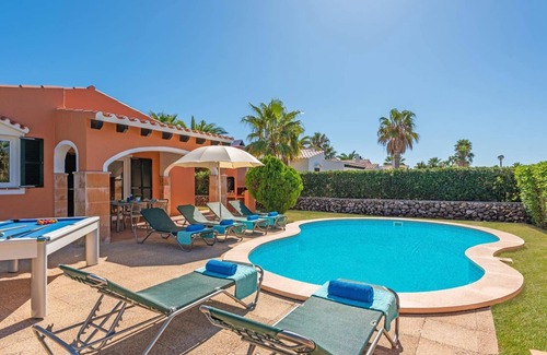 Villa Rotxa is a distinctive terracotta painted villa in the much-loved resort of Calan Bosch. With 3 bedrooms, 2 bathrooms and a terrace surrounding the private pool, it offers a great base for exploring the local area and beyond. Calan Bosch Beach is just over 1 mile away and a 25 minute stroll will take you to the popular marina with a plethora of restaurants and bars. WiFi and air conditioning/heating in the bedrooms are included.