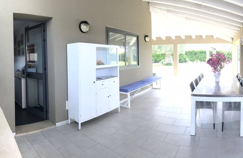 The villa offers a large private swimming pool (12x7 m, 1-2m deep), solarium (400sqm) with access to a covered veranda with table and chairs. There is also an outdoor kitchen area with a built-in barbecue on a covered veranda near the pool (with an additional portable barbecue for larger groups). External showers and toilets