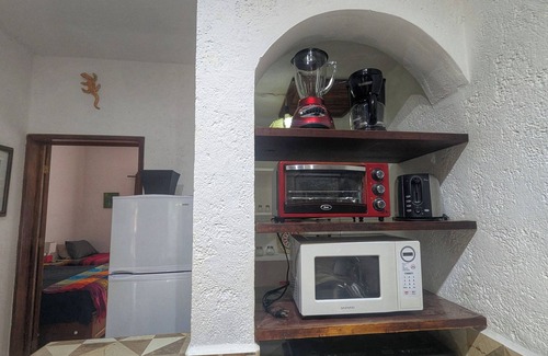 The bedroom of each Condolito is air conditioned and furnished with a queen-sized bed, closet, dresser drawers, end tables, lamps, chair, and desk with direct access to a private patio if on the ground level or a private terrace if on the upper level. Or relax in the front courtyard surrounded by beautiful tropical plants, trees, and friendly, curious geckos!