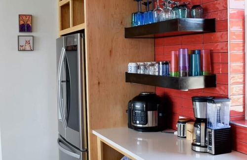 Inside, the home features three comfortable bedrooms, each with a queen bed, plus a cozy sofa bed in the front entry—allowing the home to sleep up to 7 guests in total. The well-stocked kitchen comes equipped with top-of-the-line appliances, including a wine fridge, and the living space includes a 50” TV with premium sound for cozy movie nights.