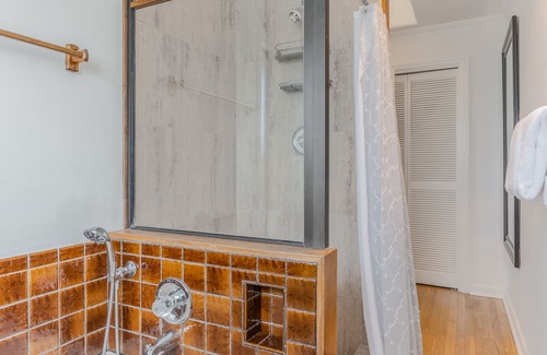 The primary bedroom boasts a California king bed, a smart TV, and direct access to the lower deck. The adjacent bath has a walk-in shower and a luxe jetted bathtub. The second bedroom has a full-size bed and an en-suite bath with a walk-in shower. The third guest room has a full-size bed and an en-suite bath with a tub/shower combination. The fourth bedroom holds a full-size bed.