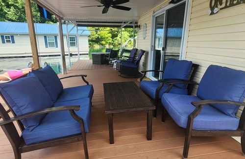 This upgraded 3-bedroom 1-bath Floating Home is located at Whitman Hollow Marina, home of Froggies Patio Bar(best wings on the lake). Home is recently remodeled with new water purification system, hot water heater and WIFI. New for 2023 is upgraded electric, AC / Heat Pump, washer/dryer and new stove. This house boasts a fully equipped kitchen and an open floor plan.