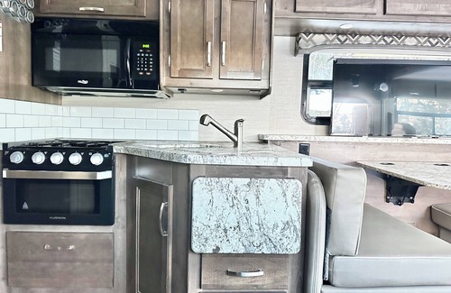 The RV is hooked up to the house power, water & sewer. Includes a separate sitting area near the garden. Guests will be staying in the main Farmhouse on the property. Rental of the full property is also available.