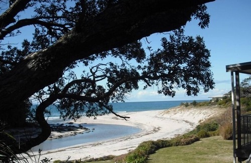 Walk straight onto the sand from the garden. Beach front AND lagoon front; overlooking Whiritoa surf beach, a safe swimming lagoon for children and beautiful New Zealand native bush. Expansive deck sea views, sheltered from the wind because of the unique location partway up the lagoon. Views can also be seen from two bedrooms, lounge and dining room. If you want relaxation, peace and quiet, this is it; no traffic and moonlight nights.
